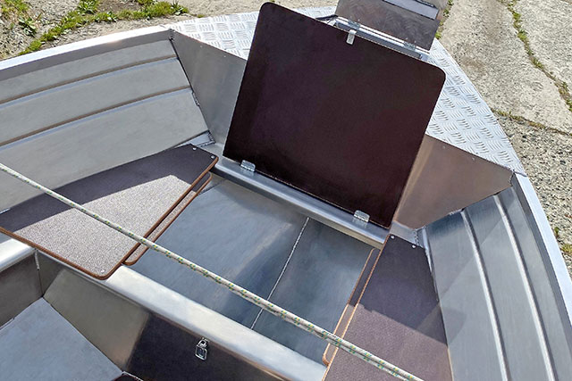Уже в базе лодка оснащена фанерным полом и деревянными сидениями. Под передними и задними банками находятся рундуки. В носовой части – вместительный якорный ящик. По бортам три алюминиевых кнехты, а также четыре поручня.