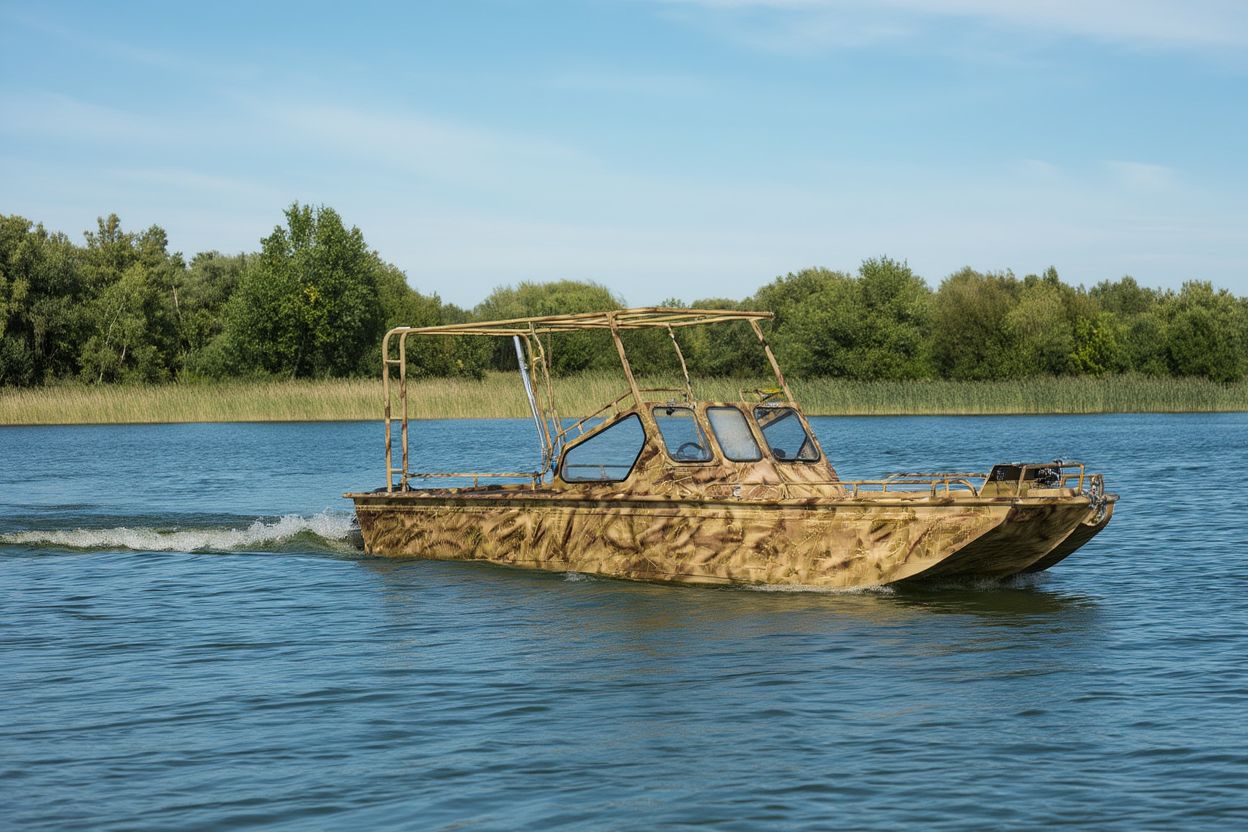 Плоскодонная лодка предназначена для охоты и рыбалки в труднопроходимых водоемах по мелководью, особенностью данной лодки является отсутствие киля, днище абсолютно плоское, что уменьшает осадку и увеличивает проходимость в купе с грязевым мотором. Данная лодка может быть укомплектована двумя двигателями мощность до 40 л.с. каждый. В лодке установлен топливный бак на 140 литров В носовой части лодки расположена лебедка, предназначенная для аварийного перемещения. В кокпите установлен обогреватель с собственным топливным баком на 20 литров. На носовой палубе размещены два рундука, вдоль каждого борта длинные рундуки и на кормовой палубе два рундука, один из которого технический, для установки аккумулятора, топливного фильтра, выключателя массы. Лодка оборудована дугами для маскировочной сети.