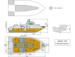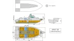 Стеклопластиковый катер Neman-500. Габаритная длина 5150 мм, ширина 1900 мм. Высота борта на миделе 870 мм, высота транца 510 мм. Максимально допустимая мощность мотора 100 л/с. Пассажировместимость 6 чел. Килеватость на миделе 14°.