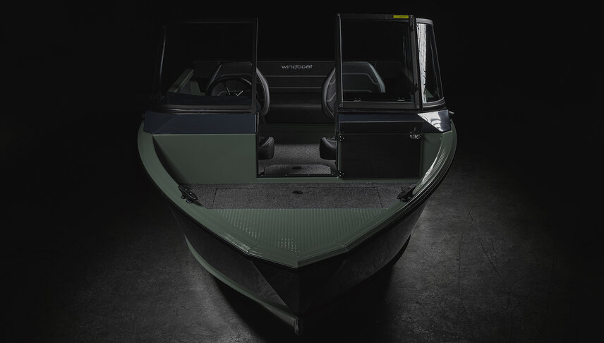 Новый Windboat 4.6 DCX. Рундук под удилища по левому борту, дополнительный рундук в основном кокпите, скрытое хранение ходового тента, мягкие накладки на кормовой диван.